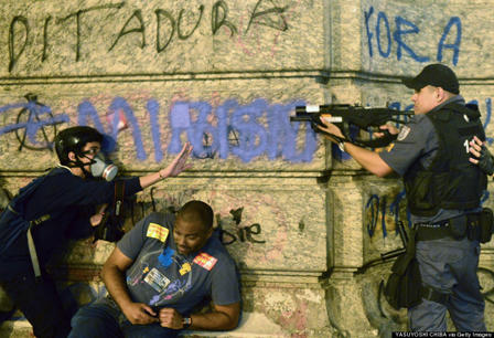 Trong cuộc biểu tình, một người mặc y phục đen, che kín mặt, leo lên một bức tường của Tòa thị chính, dùng sơn phun dòng chữ “FIFA cút đi” trong tiếng reo hò ủng hộ của người biểu tình.