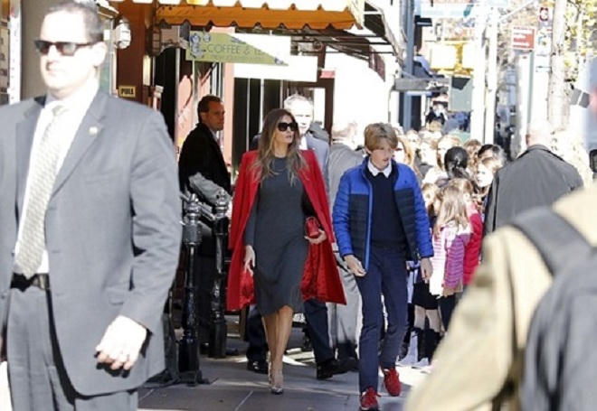 | Bà Melania Trump và con trai Barron được các Mật vụ Mỹ theo sát bảo vệ khi ra ngoài ăn trưa hôm 18/11 |