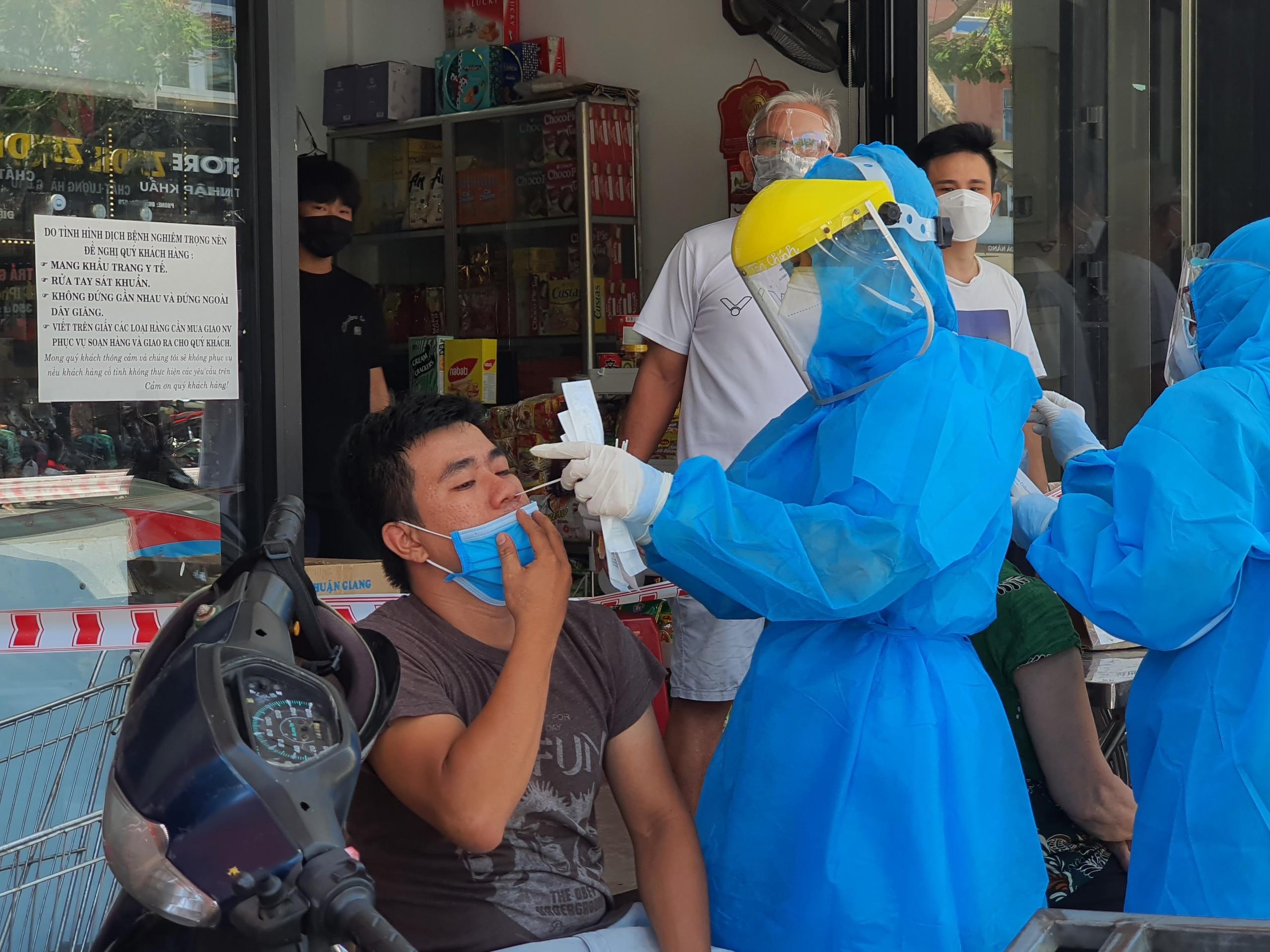 Nhân viên y tế lấy mẫu xét nghiệm cho người dân trong khu vực dân cư tam giác đang bị phong tỏa. |