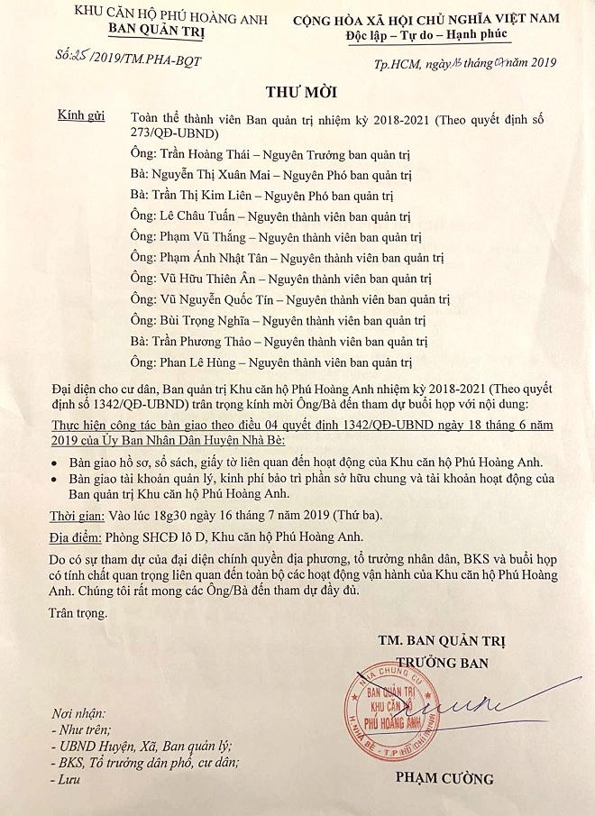 Theo tìm hiểu, BQT cũ chung cư Phú Hoàng Anh được UBND huyện Nhà Bè công nhận bằng Quyết định số 273/QĐ-UBND ngày 6/2/2018 do ông Trần Hoàng Thái làm Trưởng ban, nhưng hoạt động được một thời gian ngắn thì bị cư dân bãi nhiệm. Ngày 5/10/2018, UBND huyện dựa trên cơ sở kết quả bầu cử của Hội nghị nhà chung cư, ra Quyết định 2551/QĐ-UBND để công nhận BQT mới (nhiệm kỳ 2018-2021).