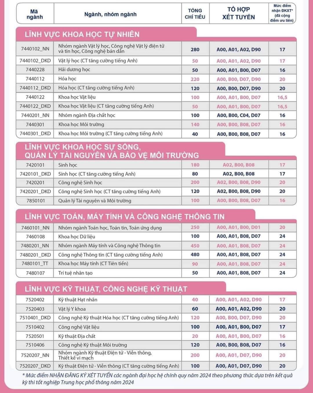 Điểm sàn dao động từ 16 điểm các ngành Hải dương học, nhóm ngành Địa chất học, Khoa học môi trường, Quản lý Tài nguyên môi trường,... đến 24 điểm với các ngành Khoa học dữ liệu, Máy tính và Công nghệ thông tin, Trí tuệ nhân tạo. Các ngành khác dao động ở 16.5, 17 và 20 điểm.