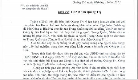 Trắng trợn hơn, kẻ xấu còn cắt ghép thông tin hình ảnh, giả danh lãnh đạo chi nhánh Carlsberg tại Trung Quốc đưa vào tờ rơi và tung lực lượng đi đồn thổi hết sức vô lý. Kẻ tung tin “tự soạn” rằng từng đi công tác nhiều nơi, vào mạng đọc nhiều thông tin và biết rất rõ Bia Huế đã bị bán cho Trung Quốc, tại Nhà máy bia Huế rất nhiều cán bộ nhân viên và công nhân người Trung Quốc đang làm việc.... (?!).