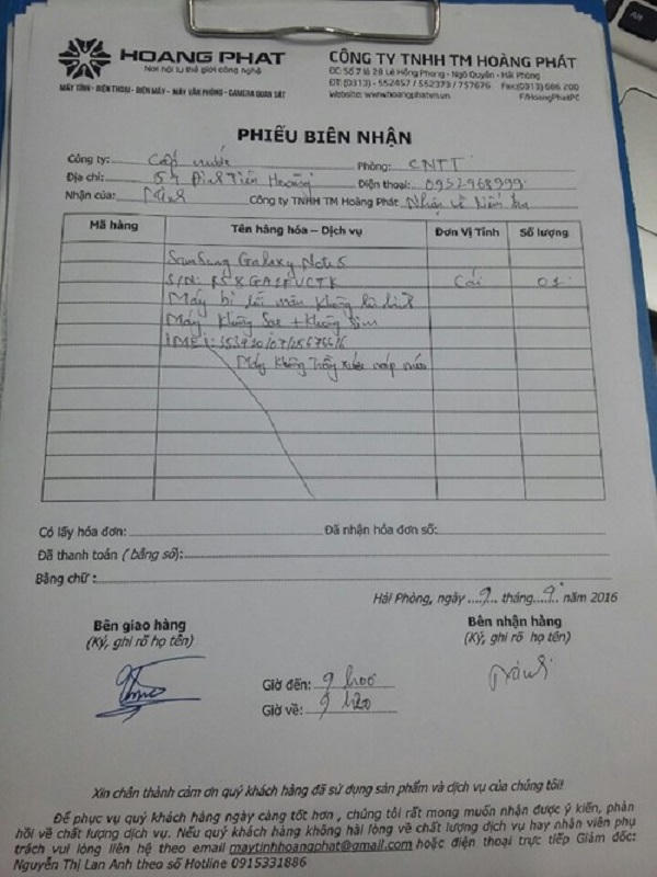 Ngày 9/4/2016 anh Điệp có mang chiếc điện thoại trên sang công ty TNHH TM Hoàng Phát (nơi anh đã mua – PV) để yêu cầu bảo hành.