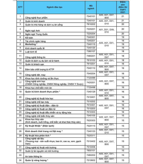 Ngành có điểm xét tuyển cao nhất là Quản trị kinh doanh và Công nghệ thực phẩm với 21 điểm.