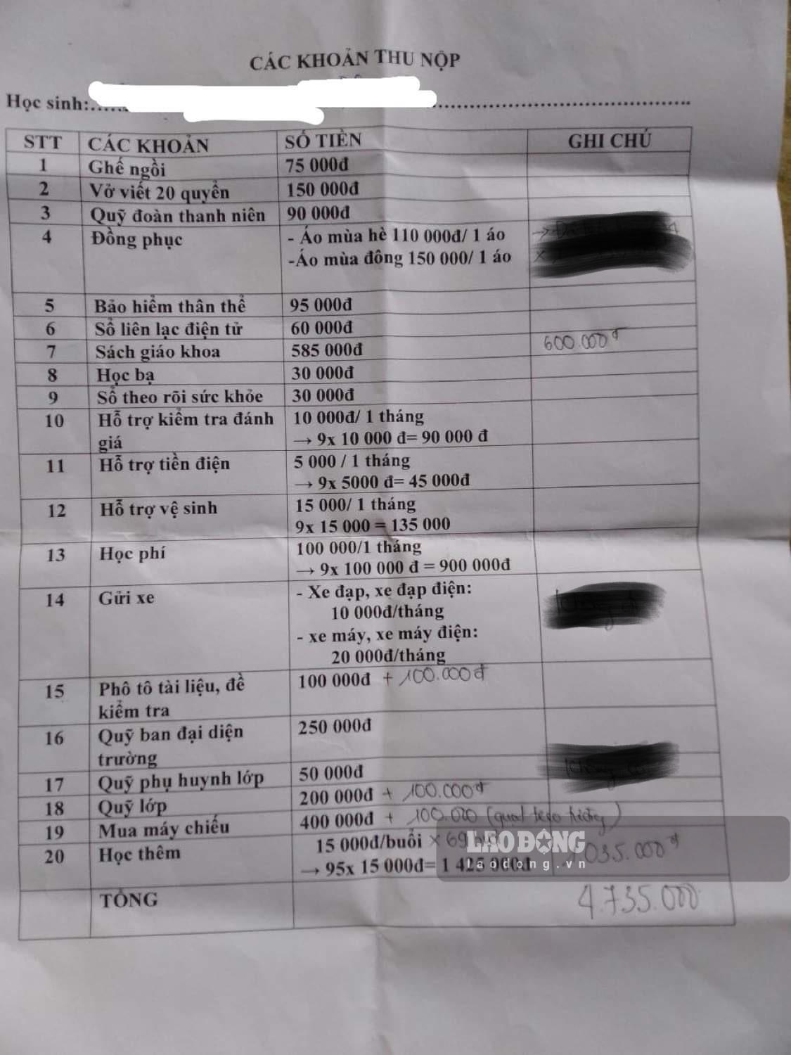 Các khoản thu đầu năm của một lớp 10 tại trường THPT 19/5. Ảnh: Báo Lao động |