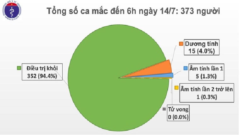 6h ngày 14/7, Bộ Y tế thông báo Việt Nam có thêm một ca mắc Covid-19 được cách ly ngay sau khi nhập cảnh. Tổng số bệnh nhân nhiễm SARS-CoV-2 là 373 trường hợp.