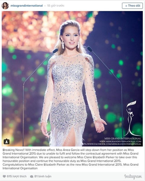 Cụ thể: “Với hiệu lực ngay lập tức, Miss Anea Garcia sẽ bị tước bỏ danh hiệu Hoa hậu Hòa bình Thế giới 2015 do không thể hoàn thành nghĩa vụ theo thỏa thuận trong hợp đồng với Ban tổ chức.