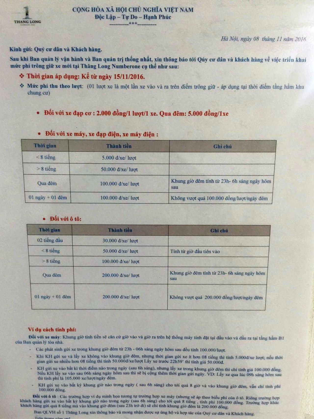 Quy định là vậy, tuy nhiên nếu muốn gửi xe tại chung cư Thăng Long Number one ( số 1 Khuất Duy Tiến, phường Trung Hòa, Cầu Giấy, Hà Nội) thì người dân phải trả 100 nghìn đồng/xe máy/ đêm và 200 nghìn đồng/ô tô/ đêm.
