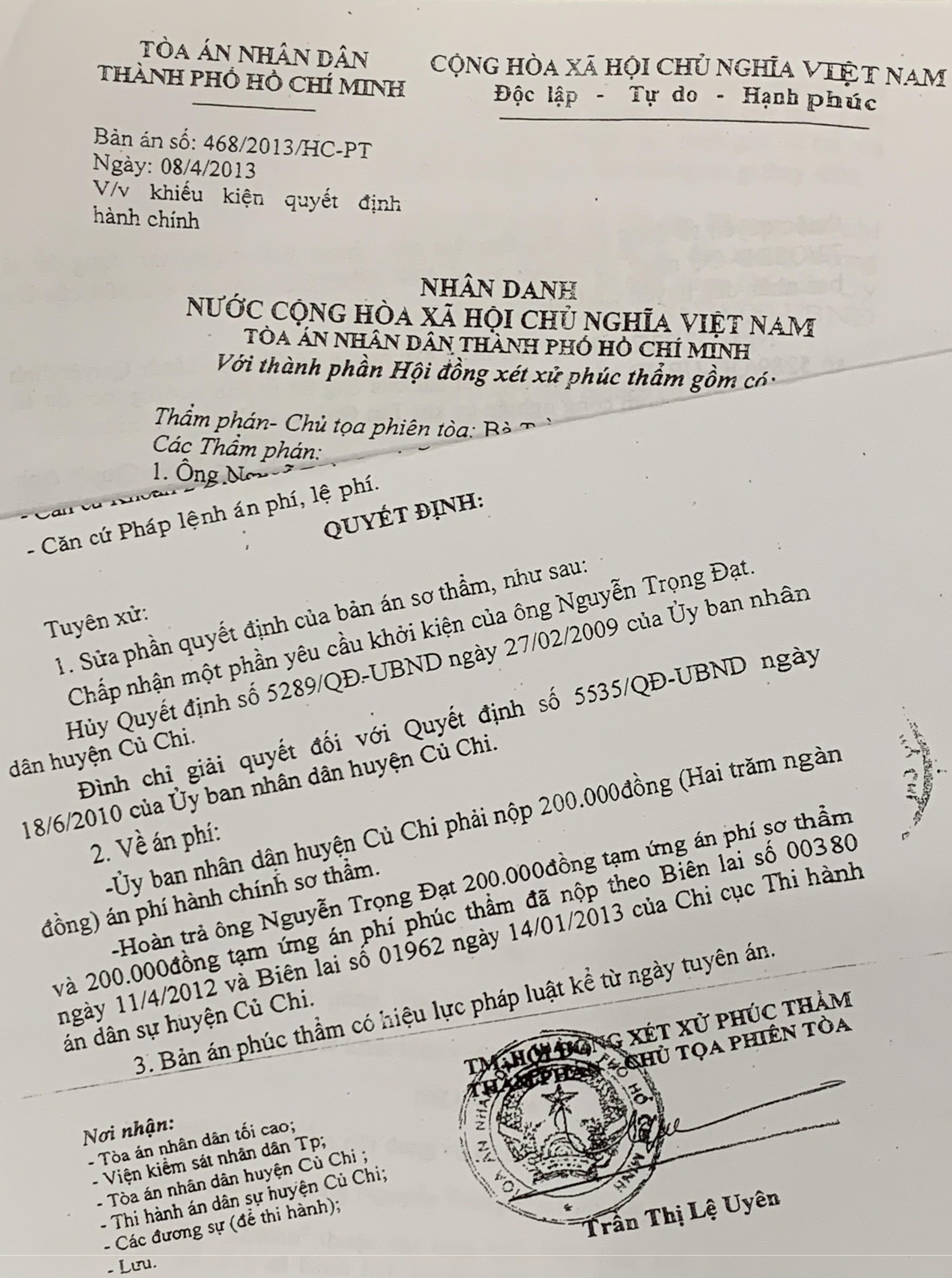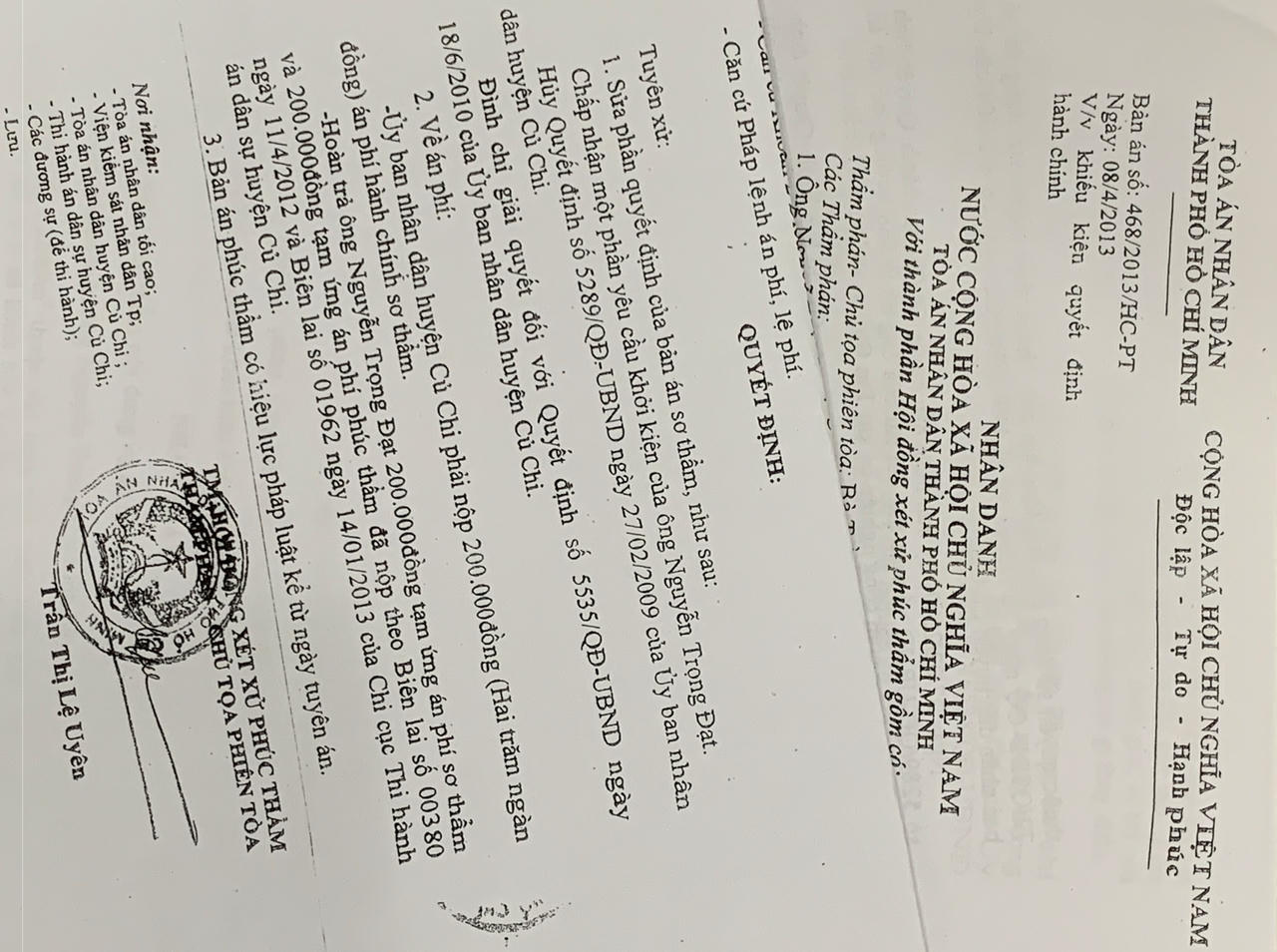 Bản án phúc thẩm số 468/2013/HC-PT ngày 08/4/2013 của Tòa án nhân dân thành phố Hồ Chí Minh đã có hiệu lực pháp luật chấp nhận yêu cầu khởi kiện của ông Nguyễn Trọng Đạt tuyên hủy Quyết định thu hồi đất số 5289/QĐ-UBND ngày 27/1/2009 của UBND huyện Củ Chi về việc thu hồi đất của ông để phục vụ cho dự án Cụm công nghiệp Tân Quy. Đây là vụ án điển hình cho chứng minh cho sự sai phạm.