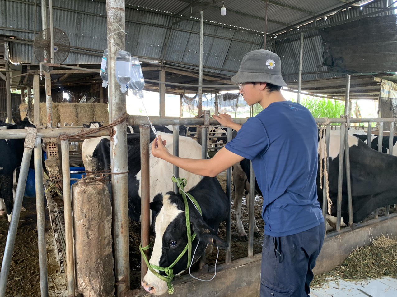 Cán bộ thú y đến trang trại bò sữa chích thuốc theo phác đồ điều trị chính thức được ban hành chiều 10/8. |