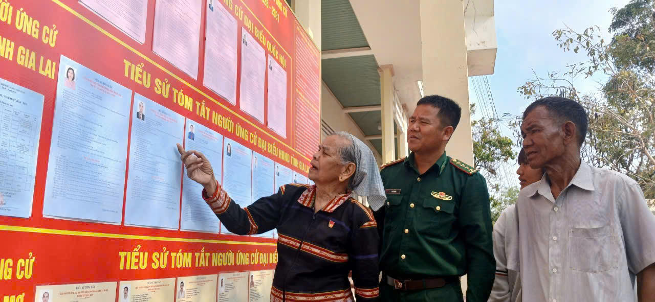 Tại Đồn Biên phòng Ia Nan, không khí hướng về ngày bầu cử cũng được thể hiện rõ từ đơn vị đến tổ công tác địa bàn. Cán bộ, chiến sĩ vừa quán triệt, nắm chắc nội dung công tác bầu cử trong đơn vị, vừa chủ động bám cơ sở, tăng cường tuyên truyền, bảo đảm thông tin đến đúng người, đúng địa bàn. Ở các điểm niêm yết, cán bộ đơn vị trực tiếp hướng dẫn người dân tìm hiểu danh sách cử tri, tiểu sử người ứng cử, qua đó giúp cử tri vùng biên tiếp cận đầy đủ hơn với thông tin liên quan đến cuộc bầu cử.