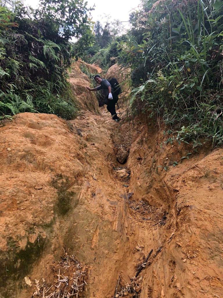 Càng vào sâu trong lòng rừng, đường càng gập ghềnh hơn. Dốc nối tiếp dốc. Cây giằng ngang mặt người. Nhưng những dấu vết của con đường cũ lại dần dần được phát lộ. Đó là những cây cầu tạm bắc qua thung, khe làm từ cây rừng đã bắt đầu mục ruỗng mà nếu không để ý, người đi sẽ thụt xuống phía dưới hàng chục mét. Đó còn là chiếc thang thô sơ hết mức khi đội công nhân chỉ kịp khắc bước vào một thân gỗ cứng rồi dựng lên đoạn dốc không thể vượt qua. Sau 5 năm, những cầu, thang leo và tay vịn chắn bên vực ngày ấy giờ đang hồi sinh, từng chồi mới đua nhau mọc lên xanh mướt.