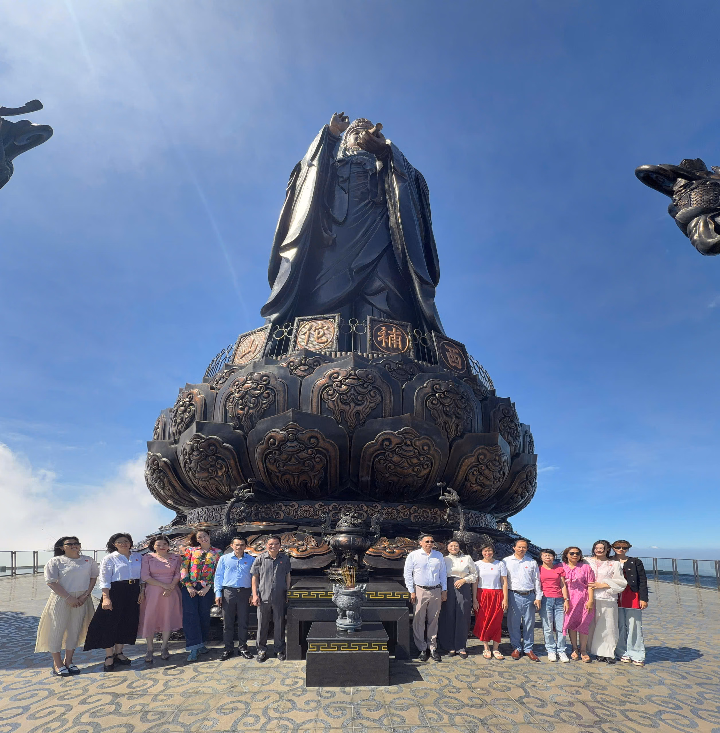 Cáp treo đưa chúng tôi lướt qua những triền núi xanh thẫm. Dưới kia, rừng cây trải dài, những con đường nhỏ uốn lượn, dòng người hành hương như những chấm nhỏ đang chậm rãi tìm về chốn tâm linh. Trên cao, gió lồng lộng thổi, trời gần, những đám mây trôi ngang hững hờ trước mặt, mang theo cảm giác khoáng đạt, nhẹ nhõm. May mắn được đứng trước tượng Phật Bà Tây Bổ Đà Sơn uy nghi giữa mây trời, chúng tôi gửi gắm những ước nguyện bình an cho gia đình, cho một năm mới sắp sang.