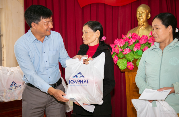 Đại diện Công ty Thép Hòa Phát Dung Quất cùng Lãnh đạo địa phương trao những suất quà Tết tới bà con tại huyện Bình Sơn, tỉnh Quảng Ngãi |
