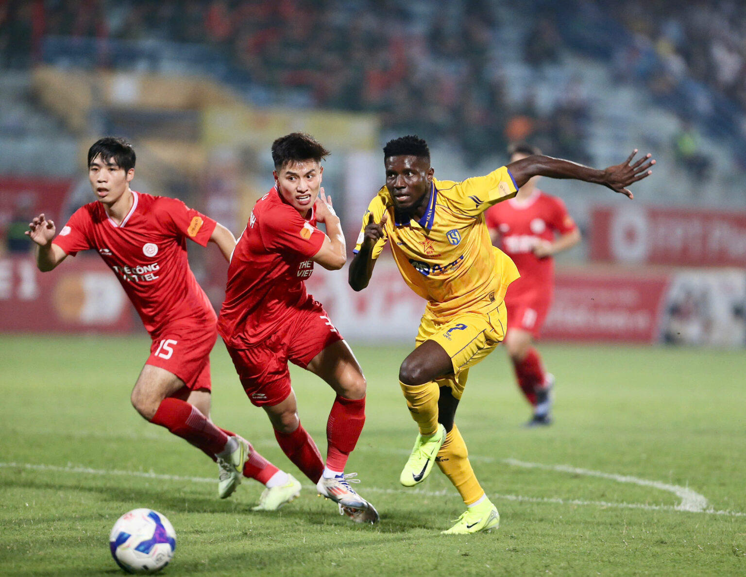 Sông Lam Nghệ An (áo vàng) trong cuộc đua trụ hạng sẽ gặp Hoàng Anh Gia Lai |