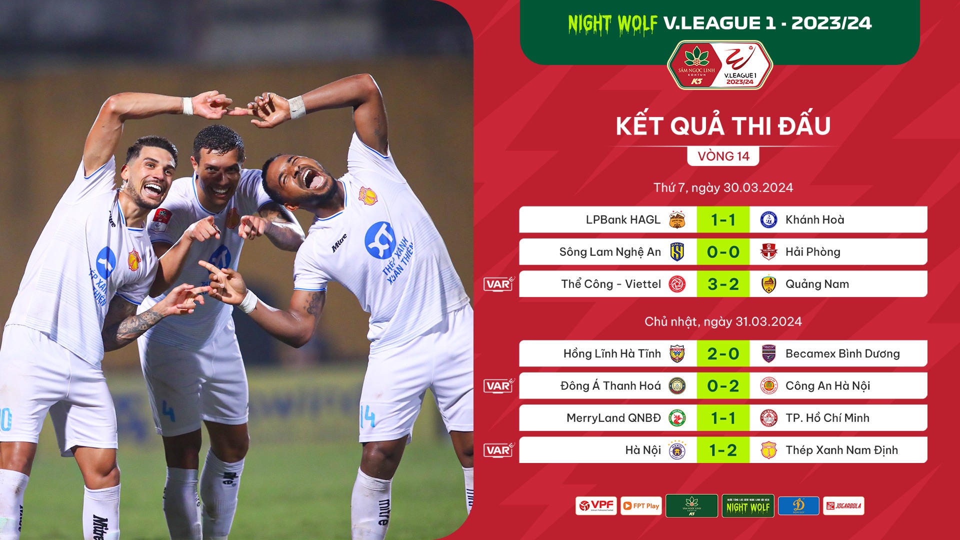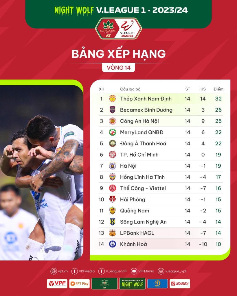 Với chiến thắng quý giá ngay trên sân của CLB Hà Nội, Thép Xanh Nam Định tiếp tục dẫn đầu bảng xếp hạng V.League sau vòng 14 với khoảng cách 6 điểm so với đội xếp thứ nhì là Becamex Bình Dương.