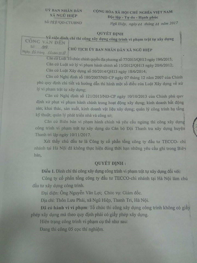 Ngày 11/11/2017 UBND xã Ngũ Hiệp đã ra Quyết định 188/QĐ-CTUBND về việc đình chỉ thi công xây dựng công trình vi phạm trật tự xây dựng của Công ty CP Tổng Cty Đầu tư Tecco - Chi nhánh Hà Nội. Cụ thể, công trình đã có hành vi tổ chức thi công không có GPXD theo quy định, vi phạm điều c khoản 6, Điều 13, Nghị định số 121/2013/NĐ-CP ngày 10/10/2013 của Chính phủ và xử lý theo khoản 2, Điều 12, Nghị định 180/2007/NĐ-CP ngày 7/12/2007 của Chính phủ.