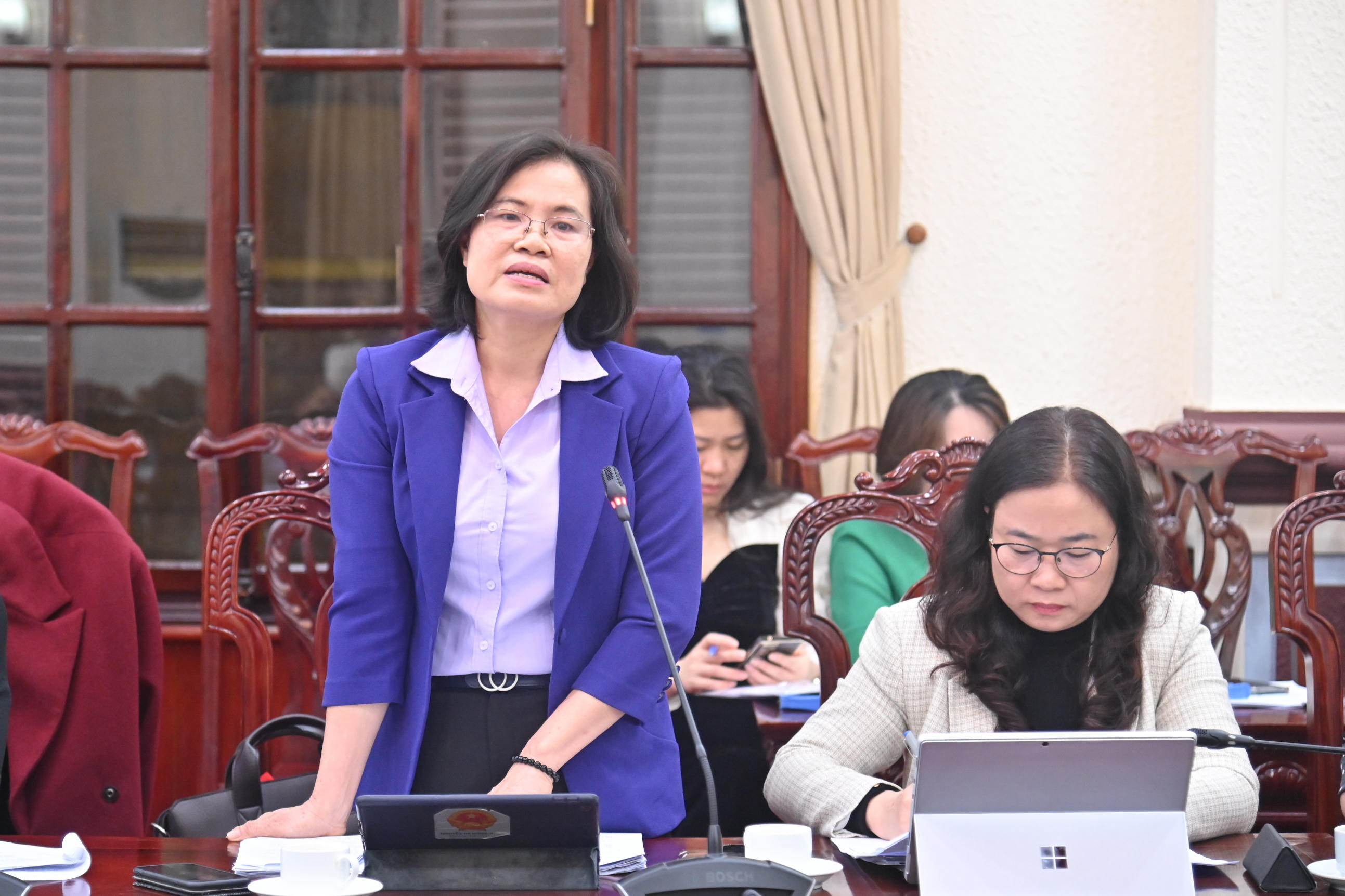 Bà Đỗ Thị Thanh Hương, Phó Vụ trưởng Vụ Các vấn đề chung về xây dựng pháp luật trao đổi tại cuộc họp. |