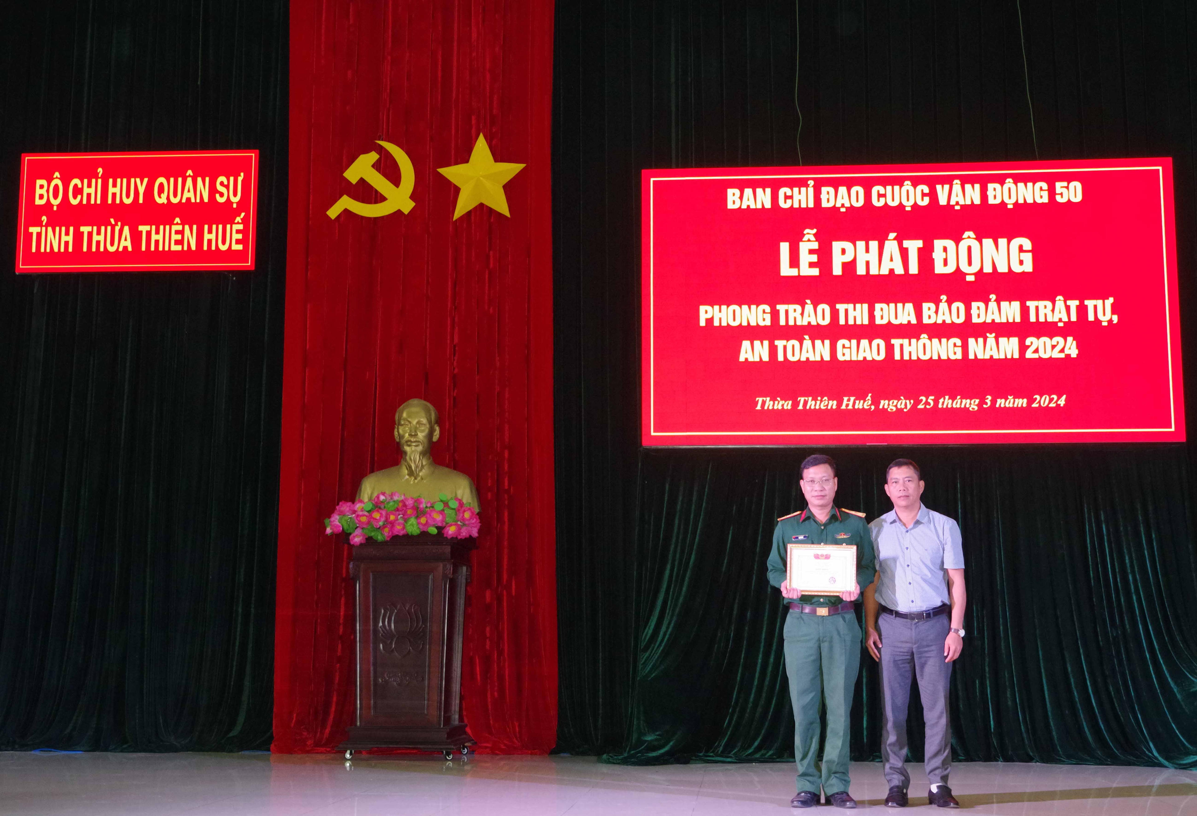 (PLVN) - Sáng 25/3, Bộ CHQS tỉnh Thừa Thiên Huế tổ chức lễ phát động phong trào thi đua bảo đảm trật tự an toàn giao thông năm 2024 với chủ đề “Thượng tôn pháp luật để xây dựng văn hóa giao thông an toàn”.