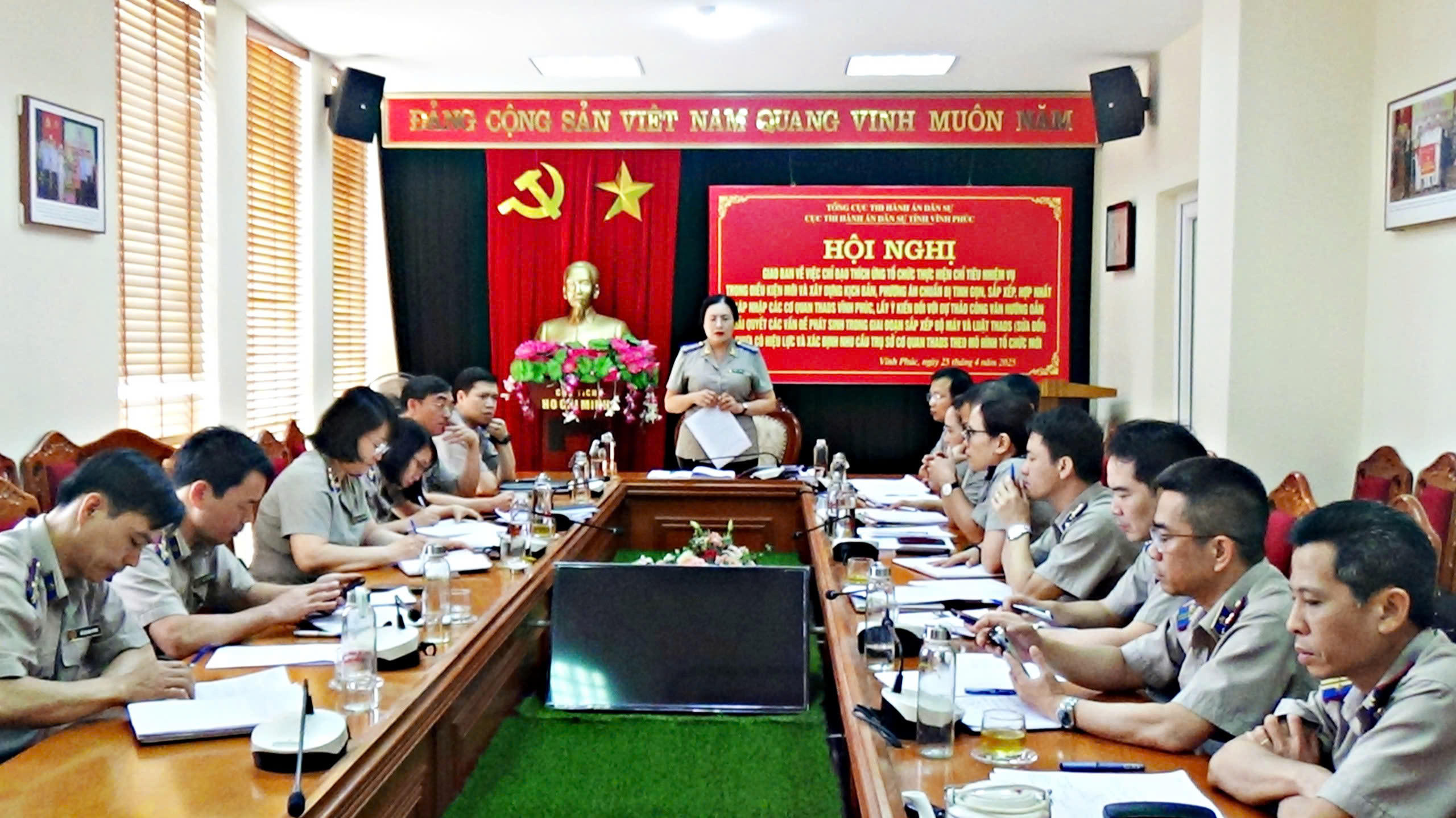 (PLVN) - Ngày 25/4/2025, Cục Thi hành án dân sự Vĩnh Phúc tổ chức Hội nghị chỉ đạo thích ứng thực hiện chỉ tiêu nhiệm vụ trong điều kiện mới và xây dựng kịch bản, phương án chuẩn bị tinh gọn, sắp xếp, hợp nhất, sáp nhập các Cơ quan Thi hành án dân sự Vĩnh Phúc, lấy ý kiến đối với các văn bản về các vấn đề phát sinh trong giai đoạn sắp xếp bộ máy; Dự thảo Luật THADS và xác định nhu cầu trụ sở Cơ quan THADS theo mô hình tổ chức mới.