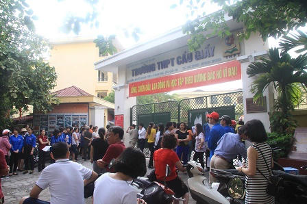 Tại điểm thi trường THPT Cầu Giấy, chị Nguyễn Ngọc Oanh (ở Nguyễn Khánh Toàn) cho biết, sáng nay chị không xin được nghỉ làm để đưa con đi thi nên chị Oanh “bàn giao” việc đưa con đi thi cho chồng. Tuy nhiên, cả đêm qua chị mất ngủ và sáng chị dậy rất sớm, lo đồ ăn cho con, dặn con mang đầy đủ giấy tờ dự thi và đồ dùng học tập. Biết tin thi xong, chị tranh thủ chạy ra hỏi han, động viên con.