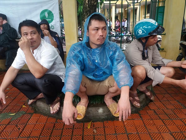 Trong lúc chờ đợi các thí sinh vào phòng làm thủ tục dự thi, phụ huynh phải mặc áo mưa đúng ngoài trời hoặc trú mưa dưới các mái hiên, gốc cây.