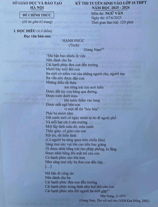 Đề thi lớp 10 môn Ngữ văn tại Hà Nội năm 2025. |