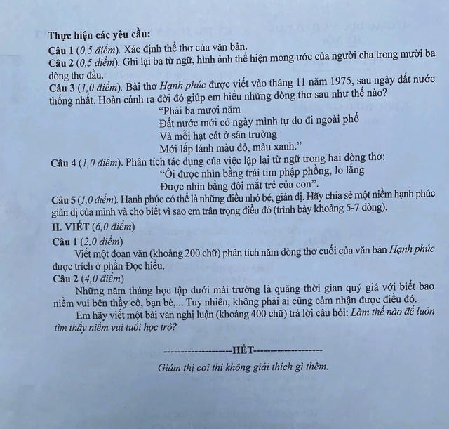 Thí sinh bắt đầu làm bài lúc 8h với thời gian 120 phút. Đề thi Ngữ văn gồm 2 phần: Đọc hiểu và Viết. Trong đó, phần Đọc hiểu (4 điểm), thí sinh được yêu cầu chia sẻ về niềm hạnh phúc giản dị. Phần Viết (6 điểm), với câu hỏi nghị luận xã hội, đề yêu cầu thí sinh viết bài văn khoảng 400 chữ với chủ đề "Làm thế nào để luôn tìm thấy niềm vui tuổi học trò?".