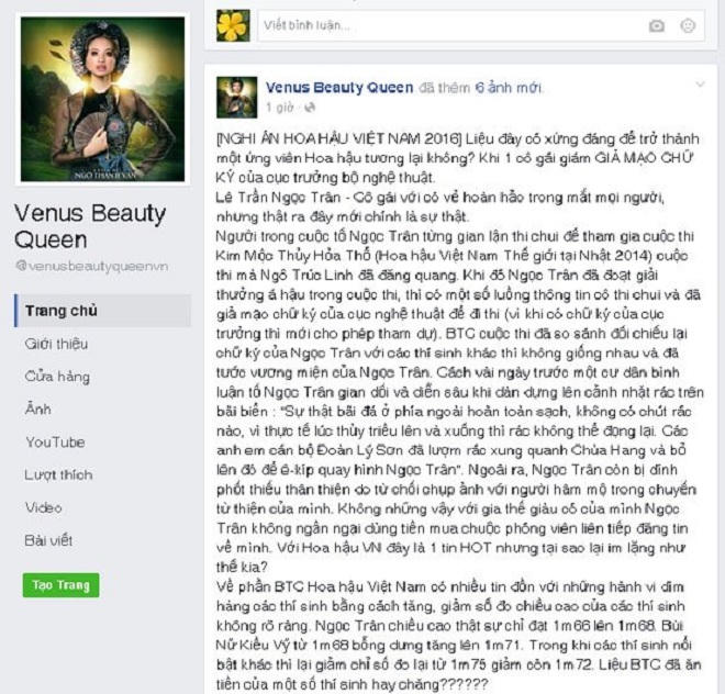 Sáng 9/8, trên trang Facebook có tên V. đăng bài khá dài, cho rằng, thí sinh Hoa hậu Việt Nam 2016 – Lê Trần Ngọc Trân – từng tham gia cuộc thi Kim Mộc Hỏa Thổ (Hoa hậu Việt Nam Thế giới 2014), tại Nhật Bản. Nguồn tin này cho hay cô đạt danh hiệu á hậu. Tuy nhiên, thí sinh bị tước danh hiệu sau đó không lâu vì bị phát hiện giả mạo chữ ký của cục Nghệ thuật Biểu diễn. Hiện status (trạng thái) tố “nàng thơ xứ Huế” đã bị xóa.