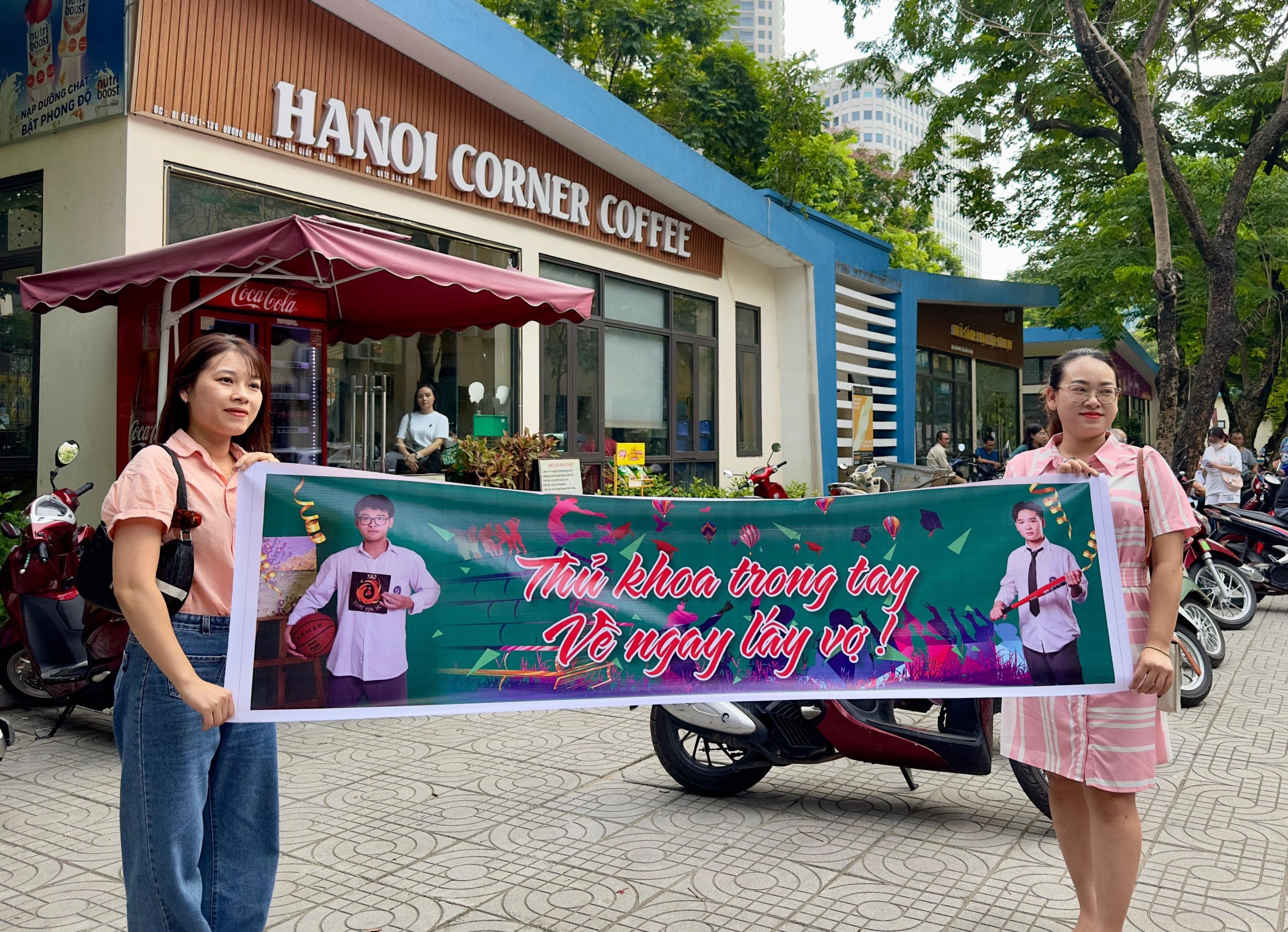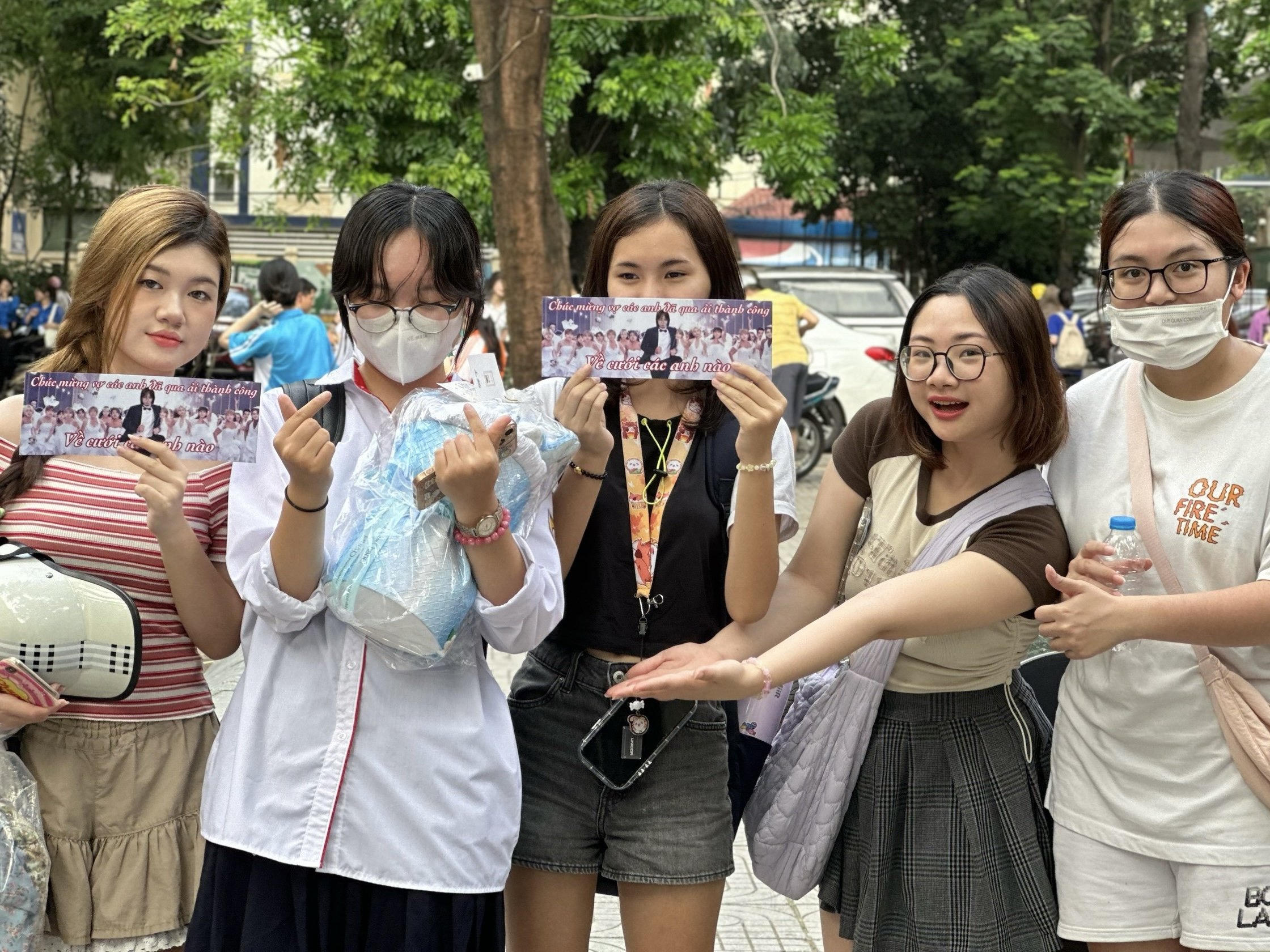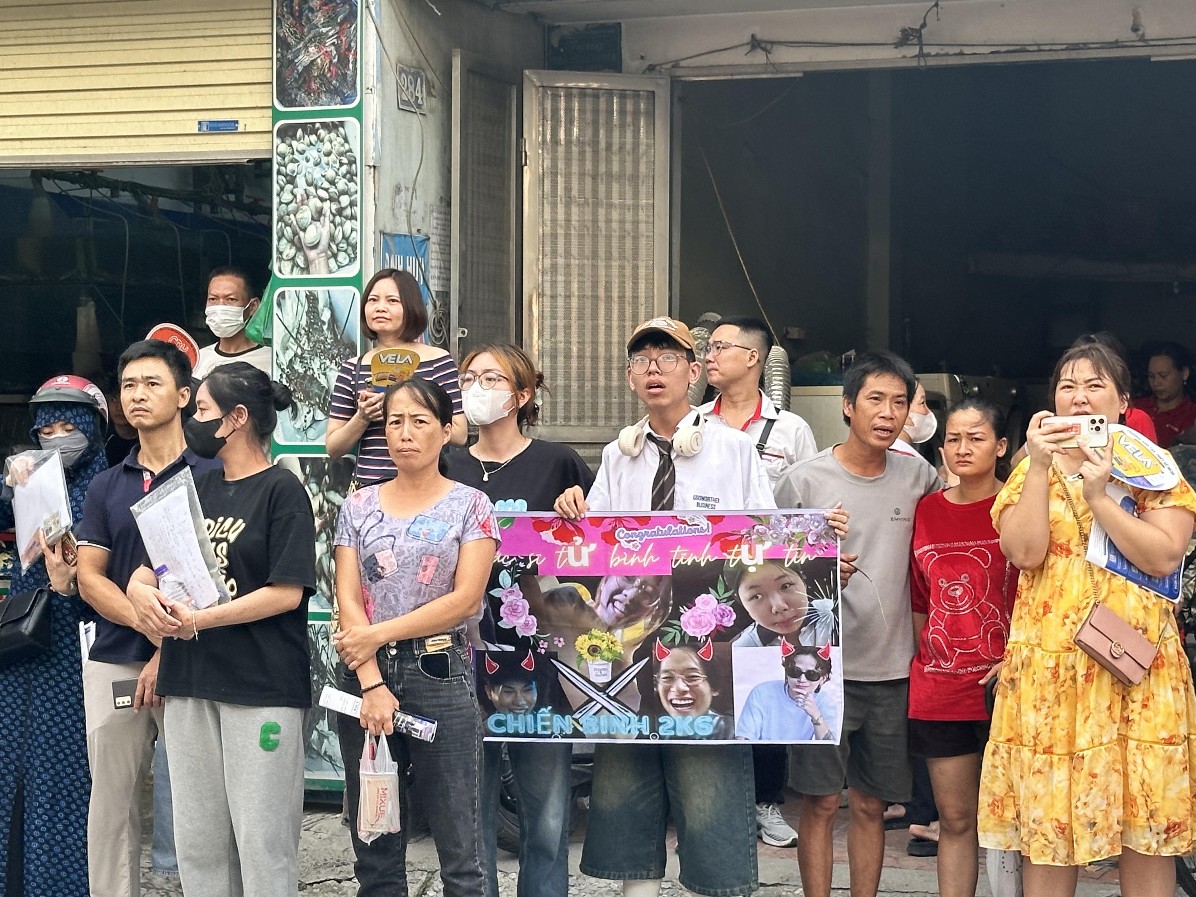 Phụ huynh mang băng rôn đến chúc mừng sĩ tử tại điểm Trường THCS&THPT Nguyễn Tất Thành. |