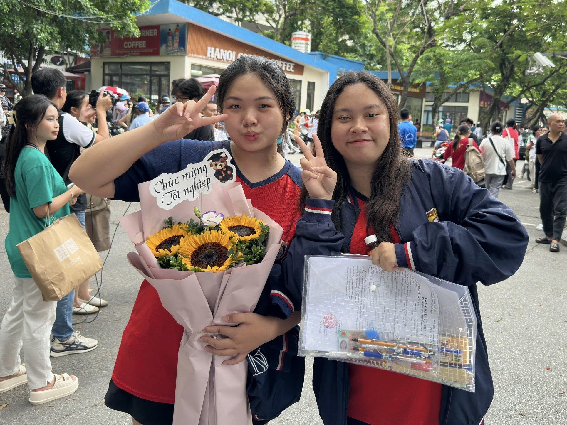 Chị Phương và con gái chụp ảnh lưu niệm sau kỳ thi. |