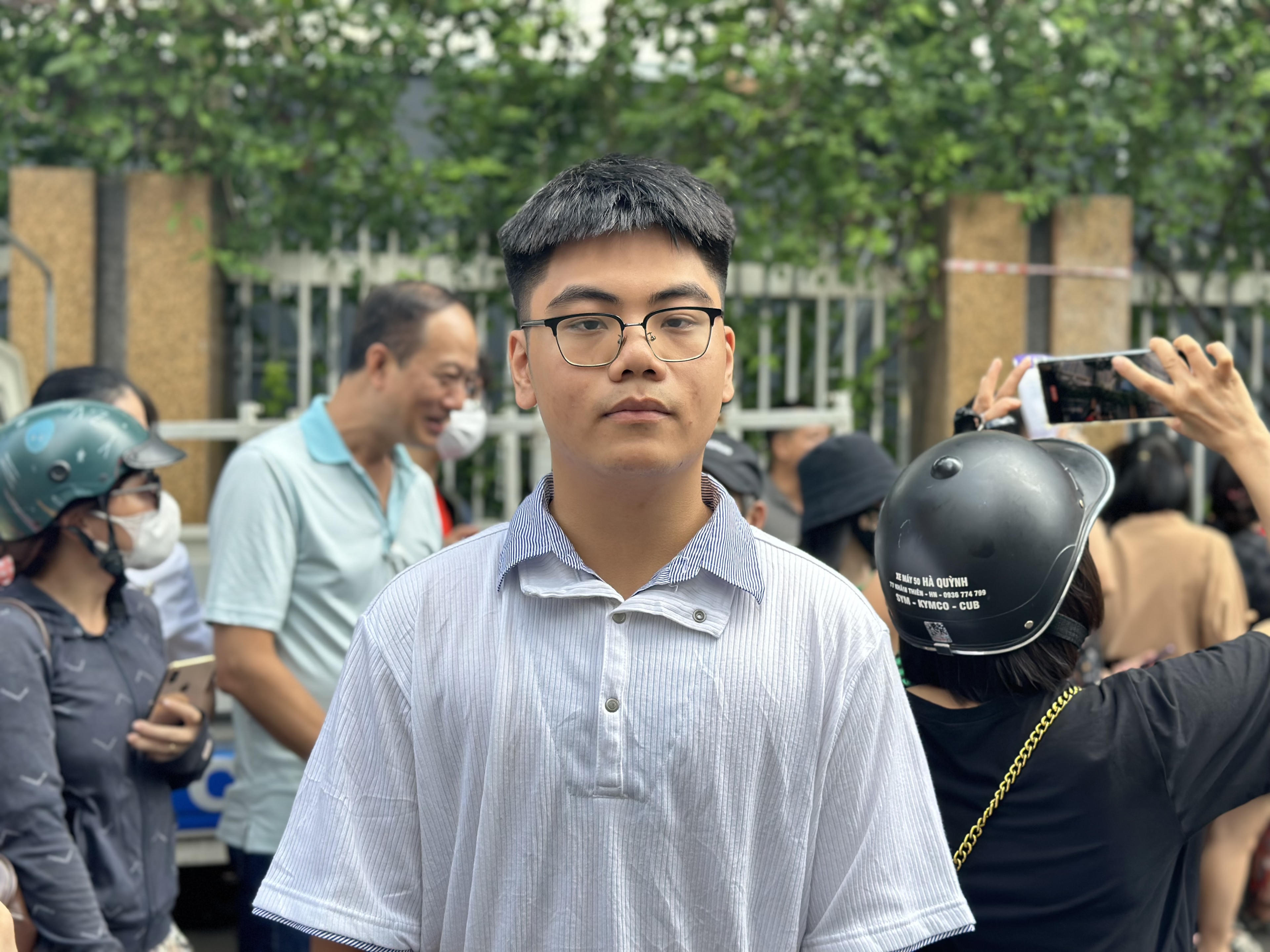 Tại điểm thi Trường THPT Phan Đình Phùng (quận Ba Đình), Tống Hoài Nam là một trong những thí sinh ra khỏi phòng thi sớm nhất. Nam đánh giá, đề thi Ngữ văn năm nay khá dễ và nam sinh này tự tin được 8 điểm.