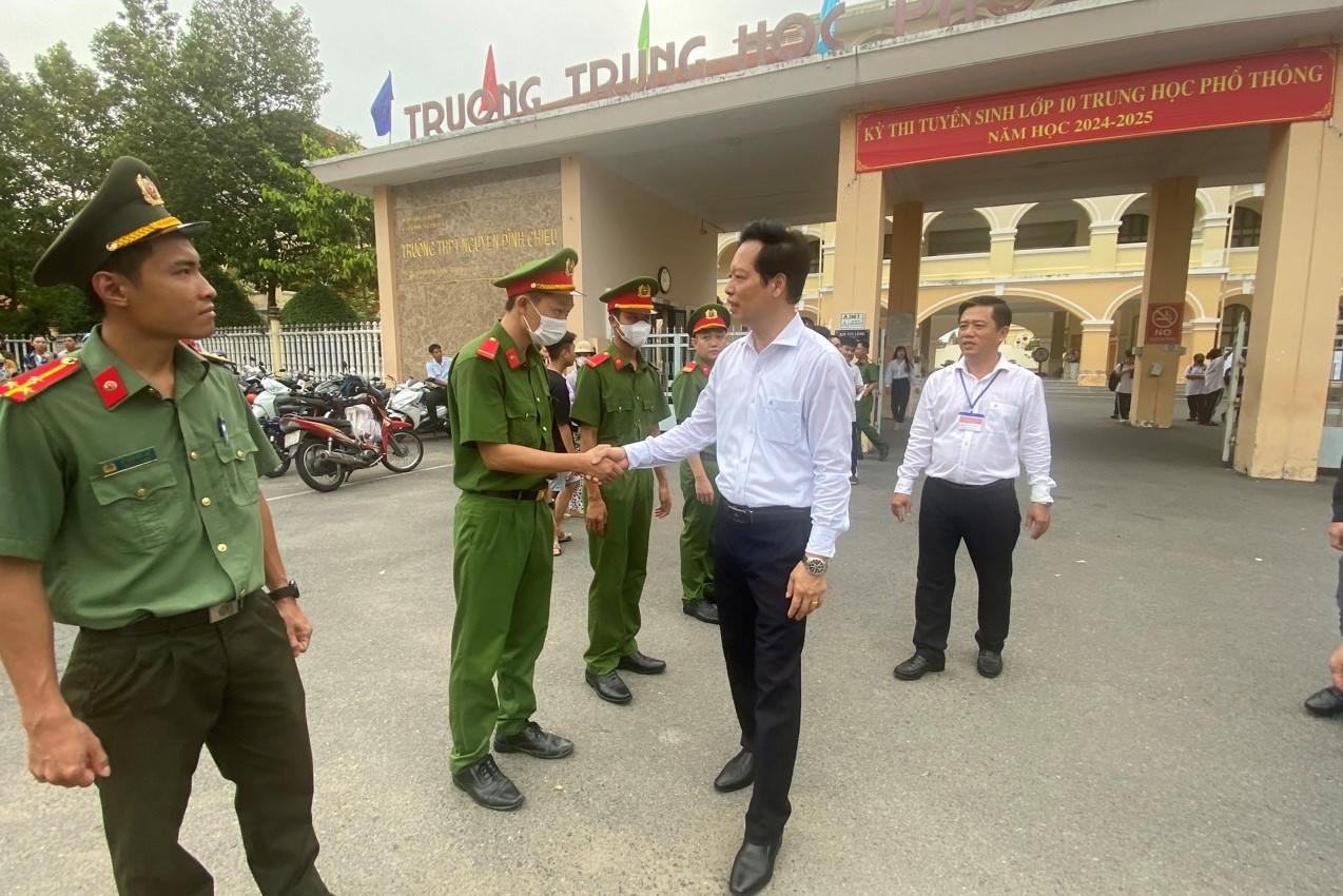 Ông Nguyễn Thành Diệu, Phó Chủ tịch UBND tỉnh đến thăm các điểm thi và động viên lực lượng an ninh. Ảnh: Xuân Uyên |