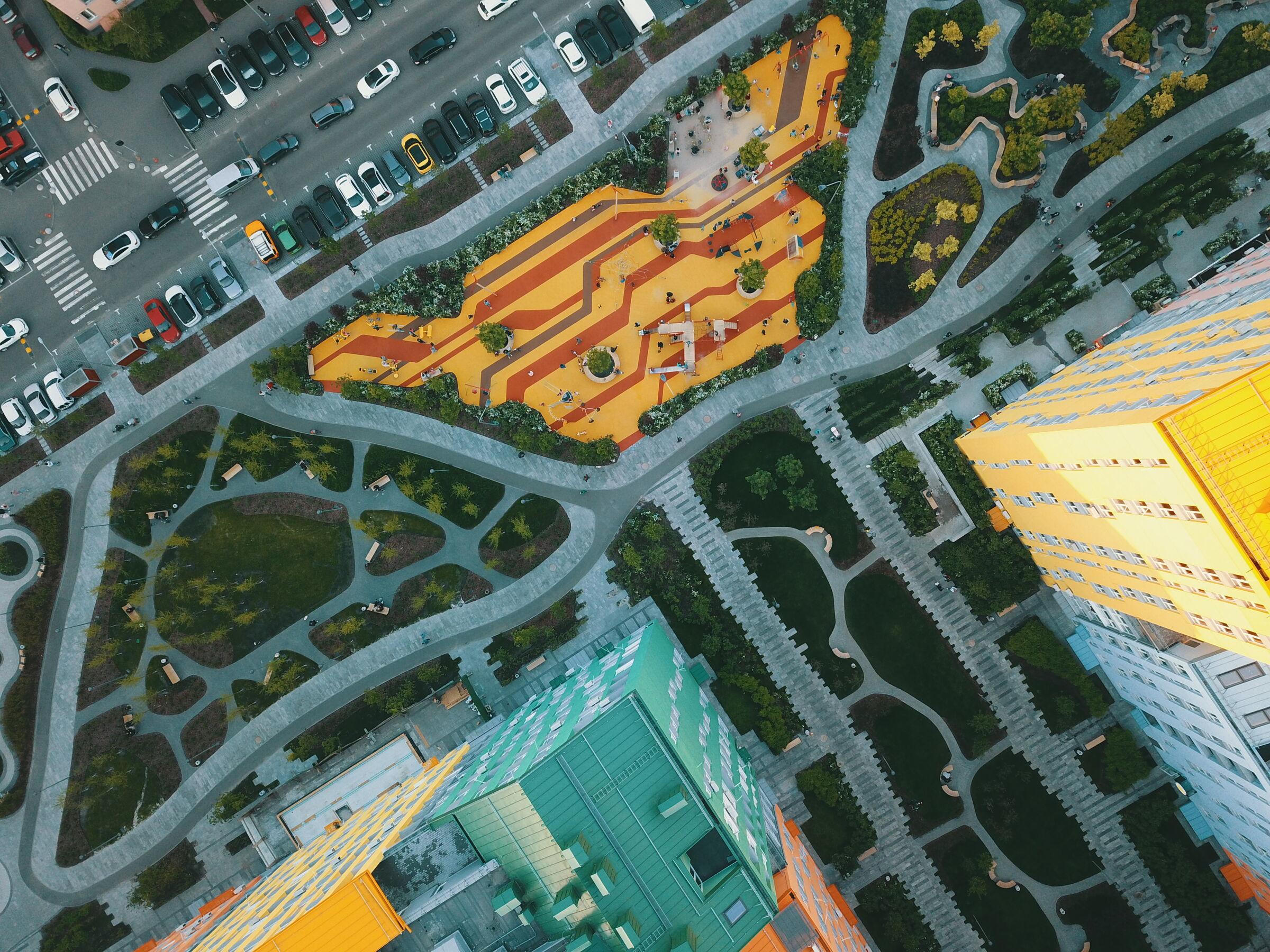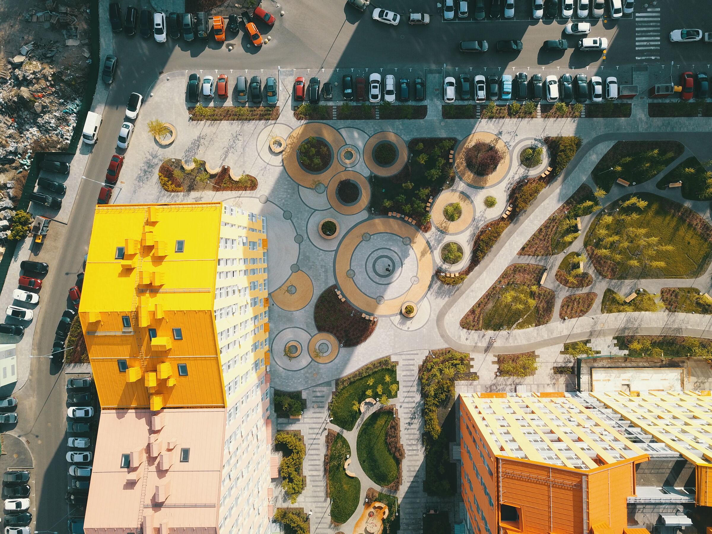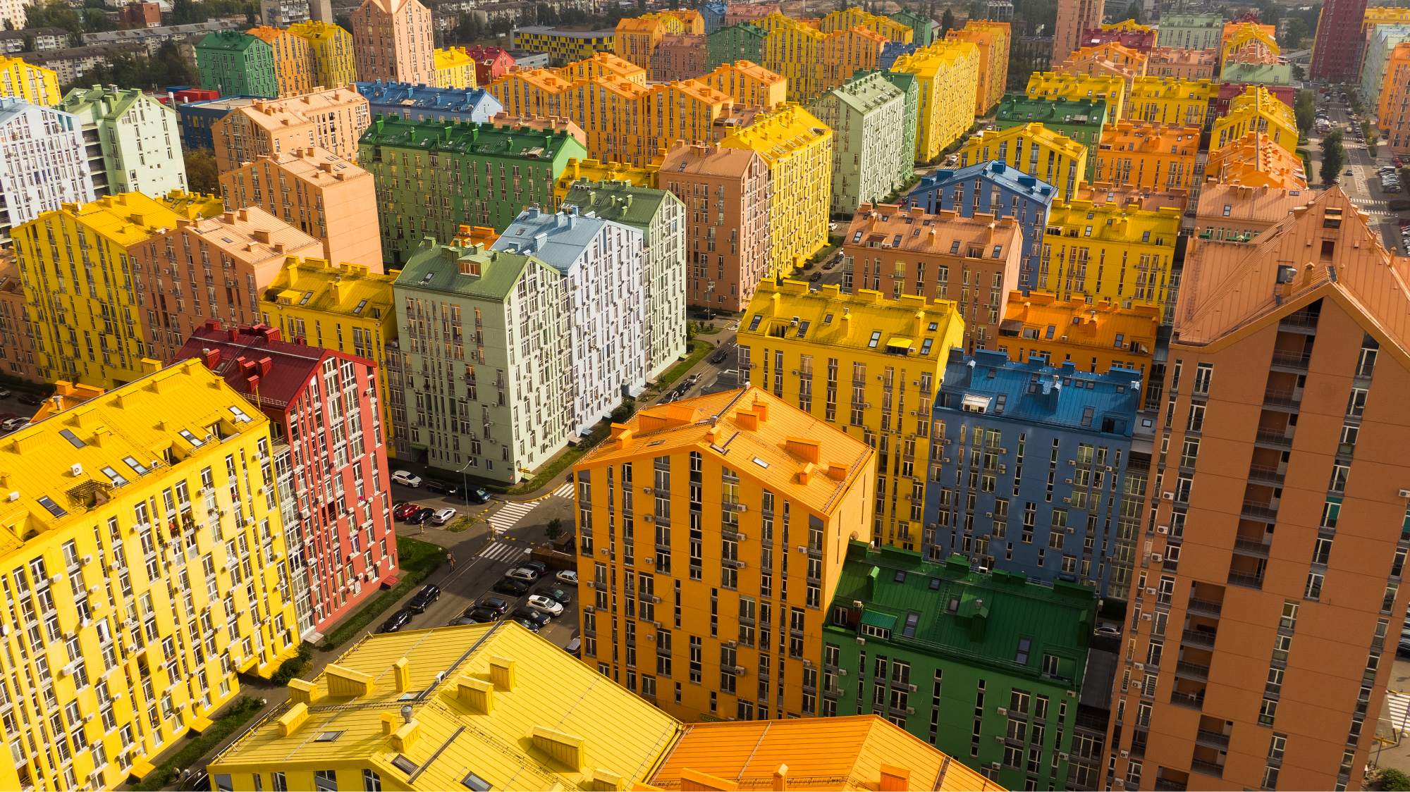 Các tòa nhà trên diện tích nửa triệu mét vuông này đều được phối bằng những màu ấm, tươi sáng như xanh lá, vàng, hồng, cam... đối lập hoàn toàn với sắc xám đơn giản, quen thuộc của những khu vực lân cận. Mục đích của việc này là để thu hút nhiều người dân tới sinh sống và lập nghiệp tại đây.