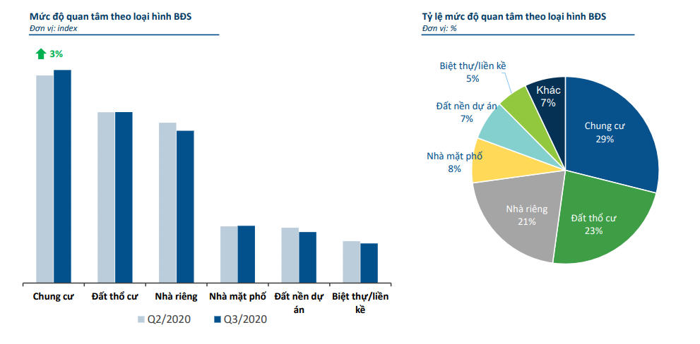 Bên cạnh đó, trong quý III/2020, chung cư là loại hình duy trì mức độ quan tâm ổn định và có lượng người quan tâm lớn nhất trên Batdongsan.com.vn. Trong số các loại hình BĐS, chung cư đứng đầu về mức độ quan tâm với 29%, kế đến là đất thổ cư với 23%, nhà riêng 21%.