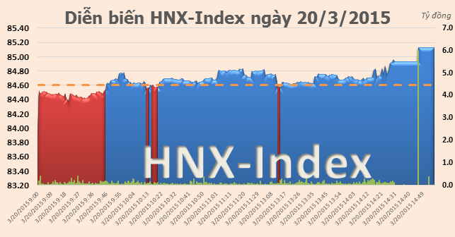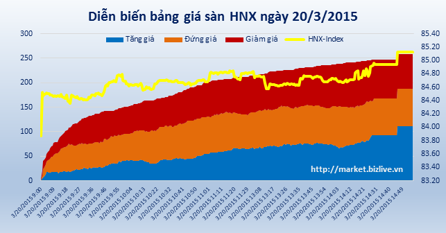 Chỉ số HNX-Index đứng ở mức 85,13 điểm, tăng 0,53 điểm (0,63%). Tổng khối lượng giao dịch đạt 37 triệu đơn vị, trị giá 524,4 tỷ đồng. Toàn sàn có 111 mã tăng, 71 mã giảm và 187 mã đứng giá.