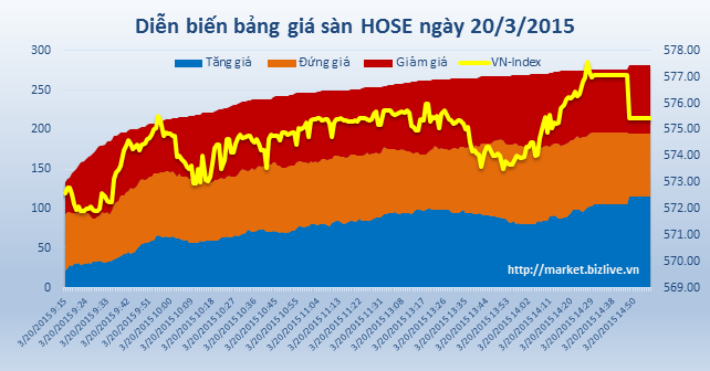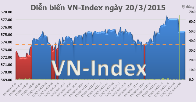 Đóng cửa phiên giao dịch buổi chiều, chỉ số VN-Index dừng lại ở mức 577,44 điểm, tăng 1,7 điểm (0,3%). Tổng khối lượng giao dịch đạt 151,53 triệu đơn vị, trị giá 3.151,8 tỷ đồng. Toàn sàn có 115 mã tăng, 86 mã giảm và 80 mã đứng giá.