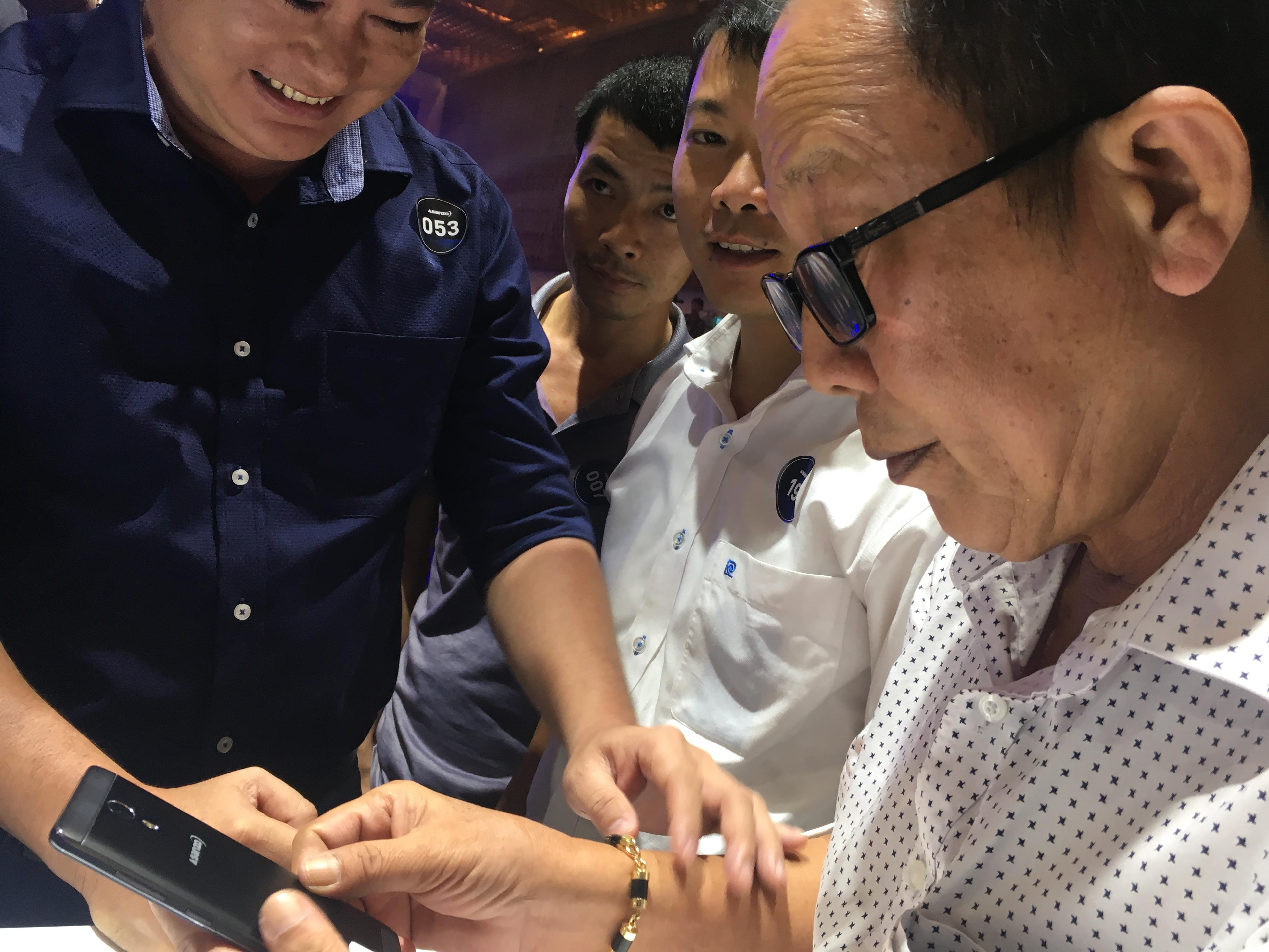 | Ông Lến, một nhà phân phối điện thoại với doanh số khoảng 6 – 7 tỷ đồng/tháng tại thành phố Cà Mau đang trải nghiệm sản phẩm smartphone Asanzo. Ảnh: Võ Anh Tuấn |