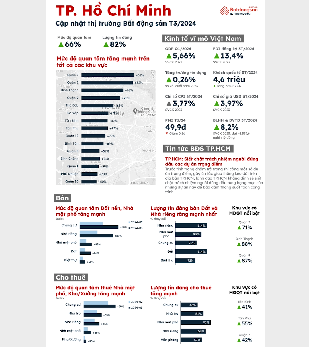Trong báo cáo thị trường tháng 3/2024 của Batdongsan.com.vn chỉ ra, mức độ quan tâm nhà mặt phố tại TP HCM tăng mạnh. Trong đó, mức độ quan tâm tại khu vực quận 2 tăng đến 62% so với cùng kỳ. |