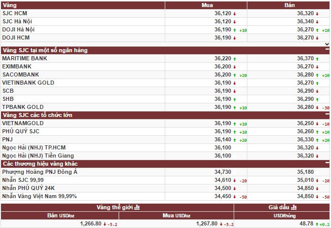 Công ty vàng bạc đá quý Sài Gòn niêm yết giá vàng SJC ở mức 36,12 triệu đồng/lượng (mua vào) và 36,34 triệu đồng/lượng (bán ra), không đổi ở cả 2 chiều mua vào và bán ra so với chiều ngày 1/8.