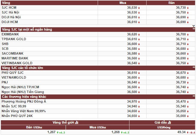 Trong khi đó, giá vàng của Tập đoàn Doji lẻ tại khu vực Hà Nội niêm yết ở mức giá 36,610 – 36, 690 triệu đồng/lượng (mua vào – bán ra), cũng giảm 20.000 đồng/lượng so với chốt phiên của ngày hôm trước.