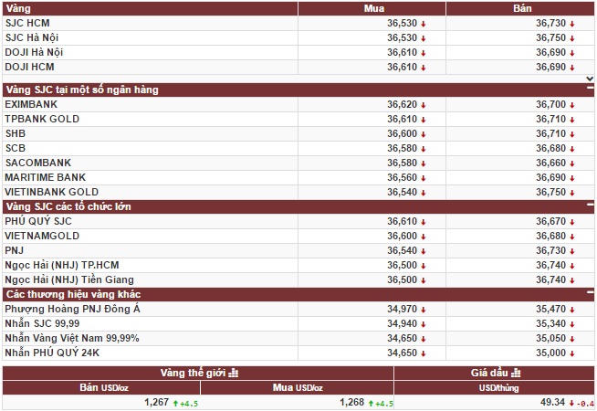 Còn giá vàng miếng SJC của Công ty Cổ phần vàng bạc đá quý Phú Nhuận tại khu vực thị trường Hà Nội, được niêm yết ở mức 36,540 (mua vào) – 36, 730 triệu đồng/lượng (bán ra), giữ nguyên mốc giao dịch so với cuối ngày hôm trước.