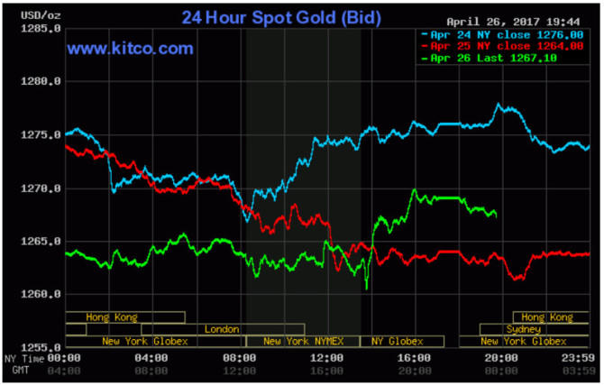 Tới đầu giờ sáng 27/4 (giờ Việt Nam), giá vàng thế giới giao ngay đứng ở mức 1.263 USD/ounce. Giá vàng giao tháng 6 trên sàn Comex New York giảm 1,6 USD xuống 1.265,5 USD/ounce.