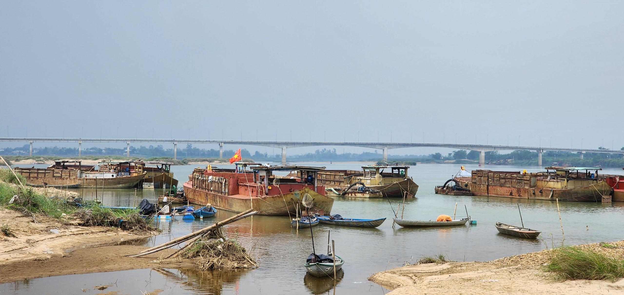 Mới hơn tháng trước, hai bến thủy nội địa dưới chân cầu Giao Thủy này như công trường khai thác khổng lồ, cung cấp cát xây dựng cho Quảng Nam, Đà Nẵng, ra đến tận Thừa Thiên - Huế, giờ chỉ còn vài đụn cát nhỏ.