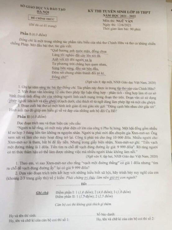 Đề thi môn Ngữ Văn. |