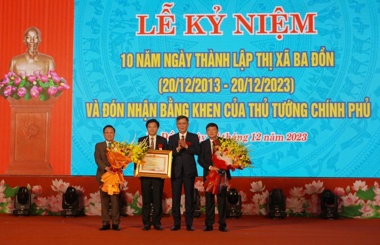 | Ông Trần Thắng, Chủ tịch UBND tỉnh trao bằng khen của Thủ tướng Chính phủ cho lãnh đạo thị xã Ba Đồn sau 10 năm thành lập. |