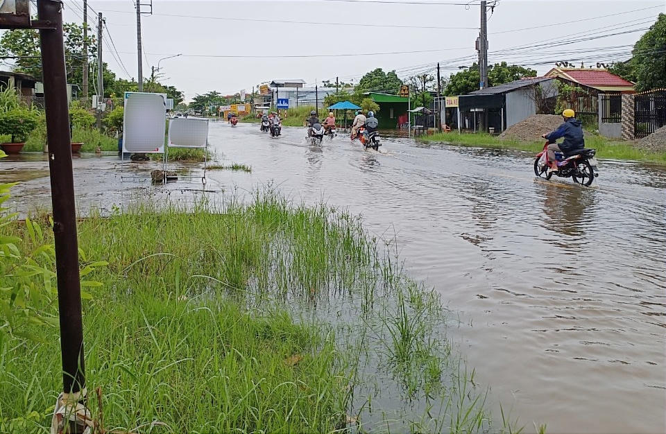 Các phương tiện lội “bì bõm” qua QL53 đoạn khóm Phước Bình. |