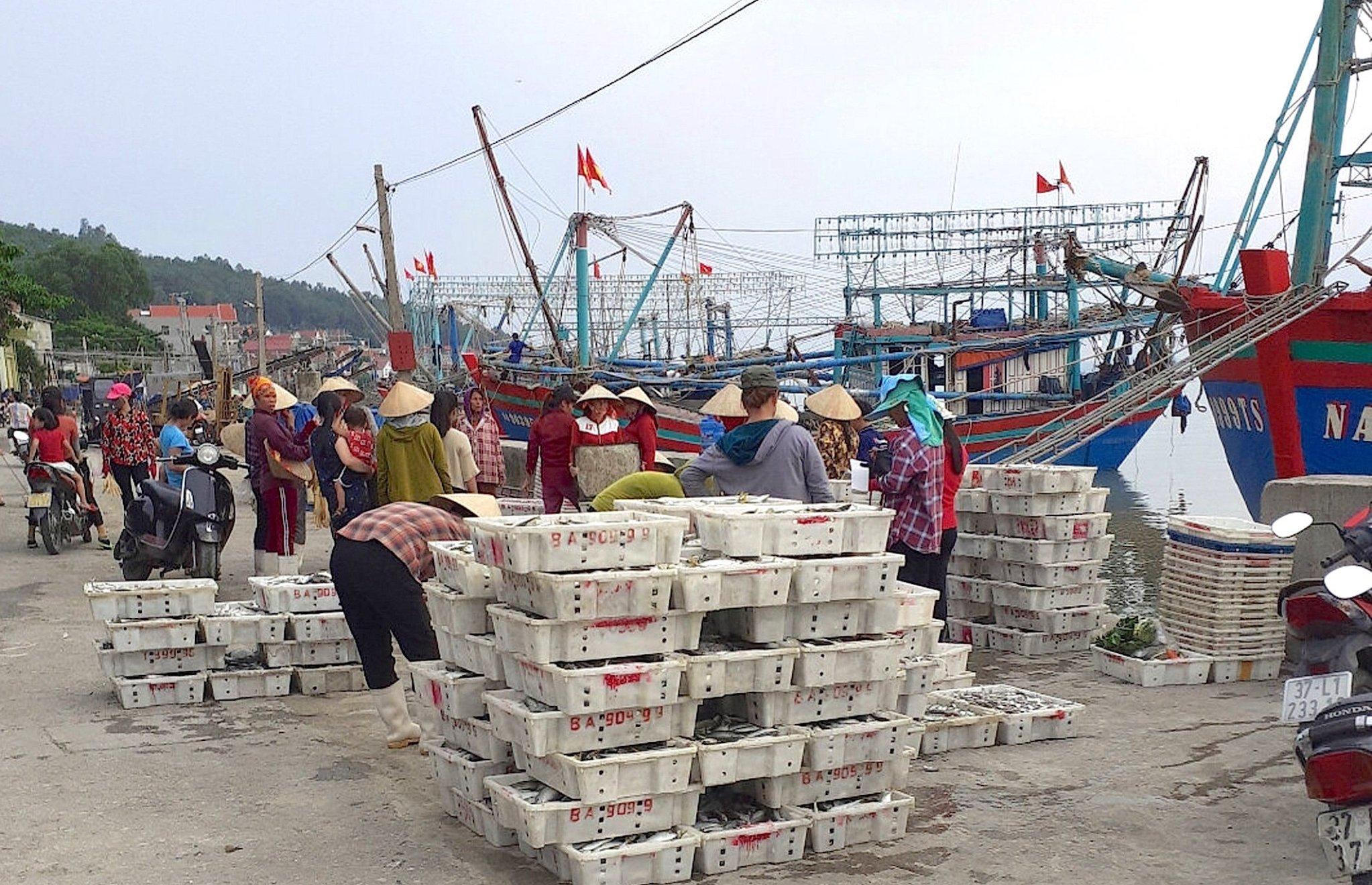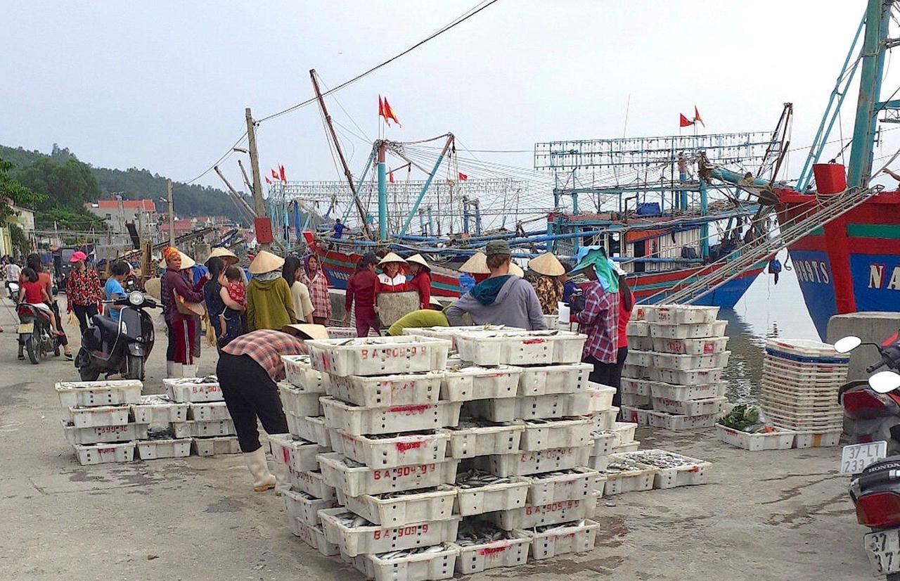 Thuyền về đầy ắp cá tôm của ngư dân Hoàng Mai. |