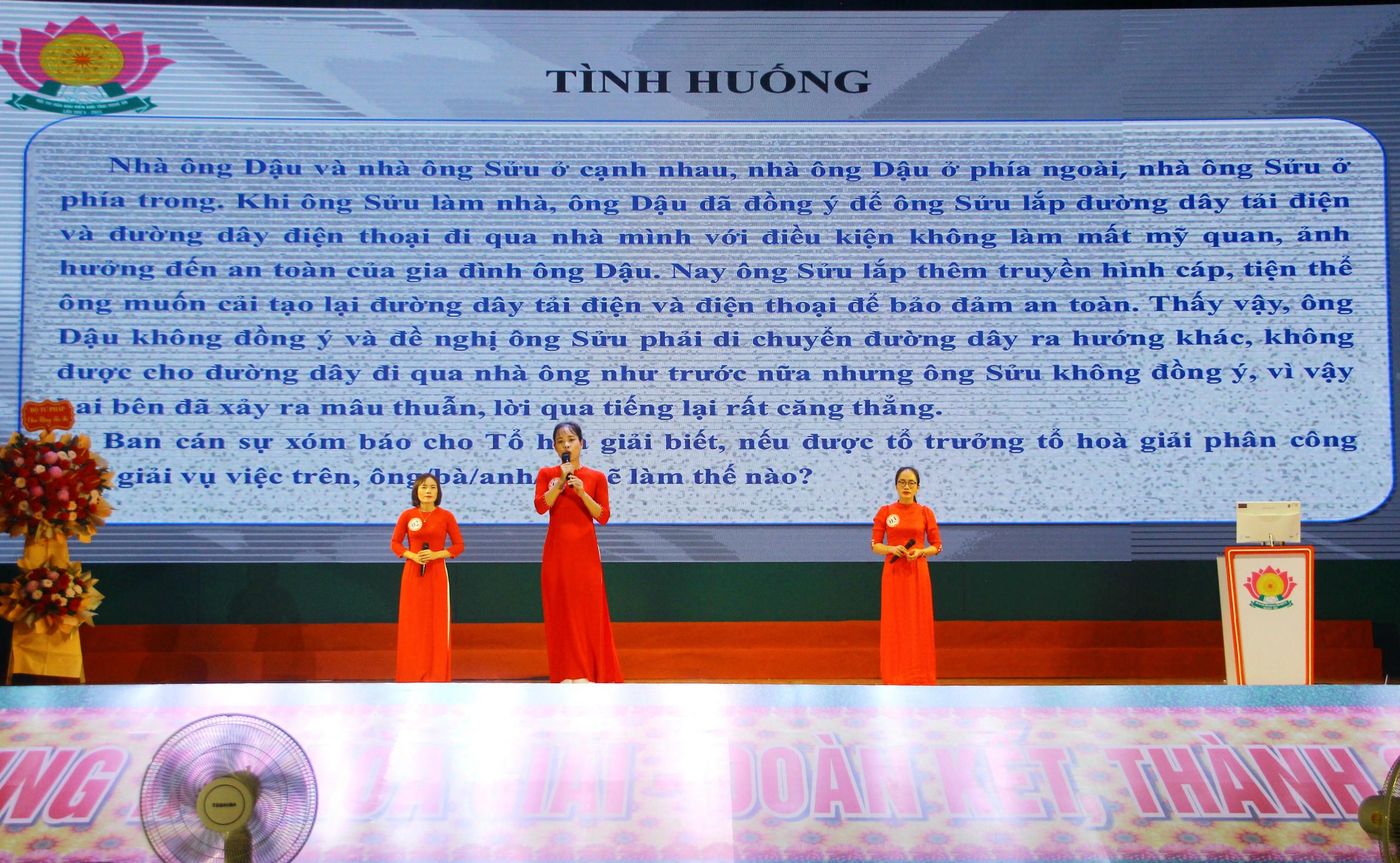 Hội thi đã diễn ra sôi nổi, qua các phần thi đã lột tả thực tế trong cuộc sống khó tránh khỏi những va chạm, mâu thuẫn, tranh chấp giữa các thành viên trong gia đình và cộng đồng dân cư. Những mâu thuẫn, tranh chấp này nếu không giải quyết kịp thời thì từ mâu thuẫn nhỏ sẽ thành mâu thuẫn lớn, từ tranh chấp dân sự thuần tuý có thể chuyển thành vụ án hình sự, gây mất đoàn kết trong nội bộ nhân dân, ảnh hưởng lớn tới an ninh trật tự ở xóm.