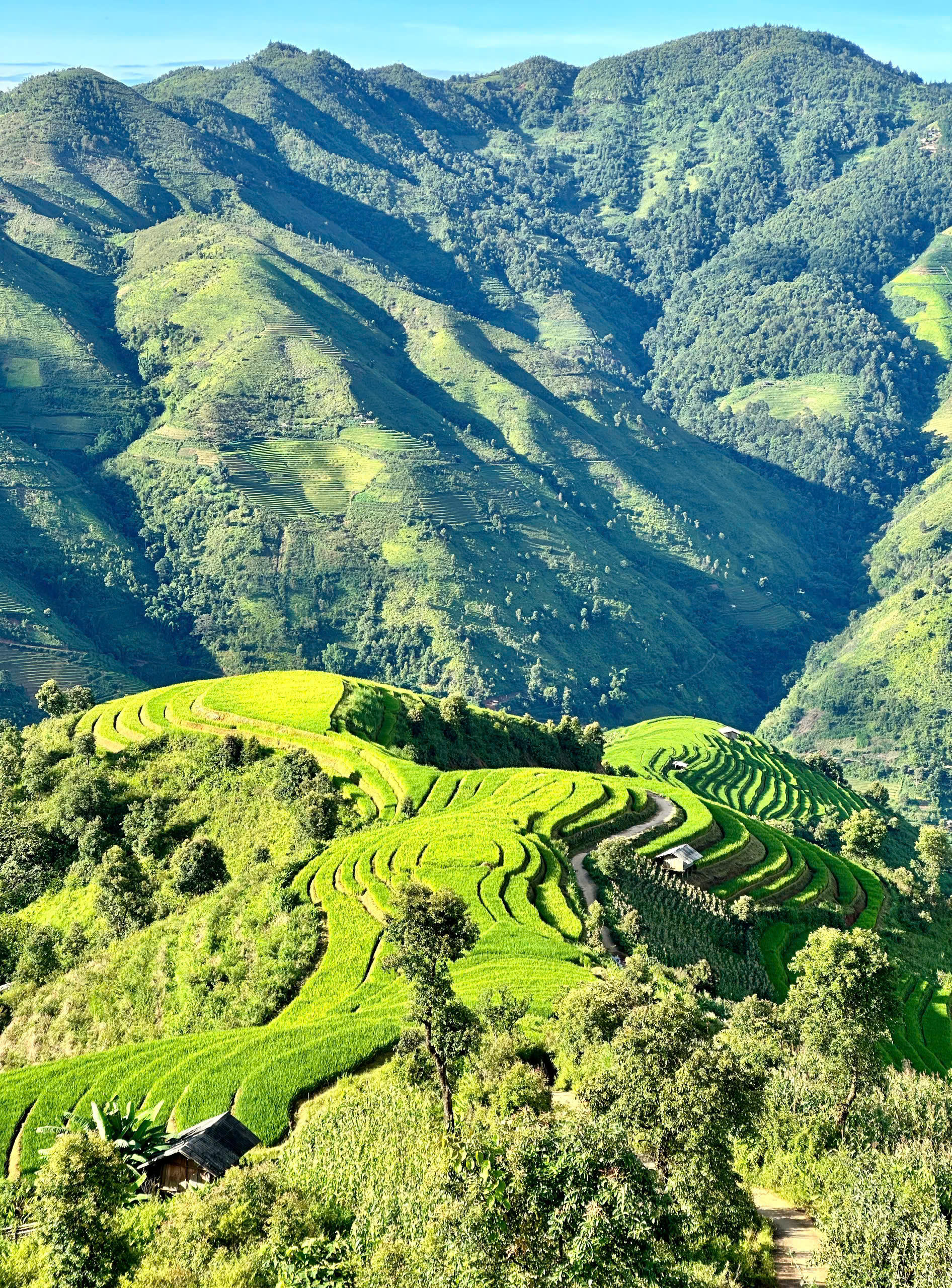Chỉ khi đặt chân đến Xím Vàng, ta mới cảm nhận được hết vẻ đẹp của nó. Những ô, thửa ruộng bậc thang xanh mơn mởn, đều tăm tắp, nằm gối lên nhau, trải dài khắp các sườn núi, như vẽ lên một bức tranh mùa hè mát mắt.